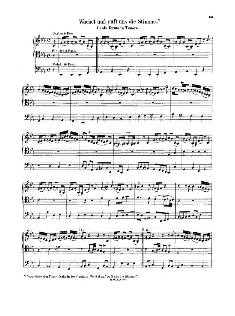 | An arrangement of Mvt. 4 of Cantata BWV 140, the Tenor Unison Choral, �Zion hört die Wachter singen3.� In the Cantata the melody is sung by the Tenor or Tenors in unison. In the Prelude it is assigned to an eight-foot stop on the �sinistra� manual. |